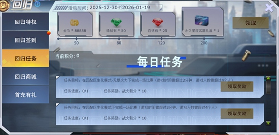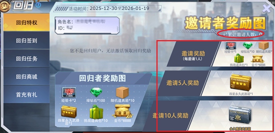 【参与方式】主界面右侧“老兵回归”按钮,选择回归任务页面
