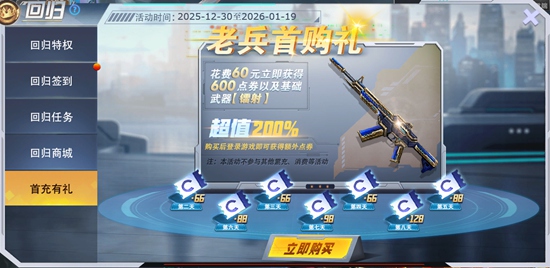 【参与方式】主界面右侧“老兵回归”按钮,选择回归商店页面