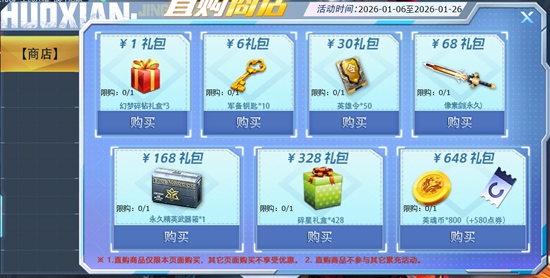 【活动内容】在界面点击即可以对应的价格获得指定道具: