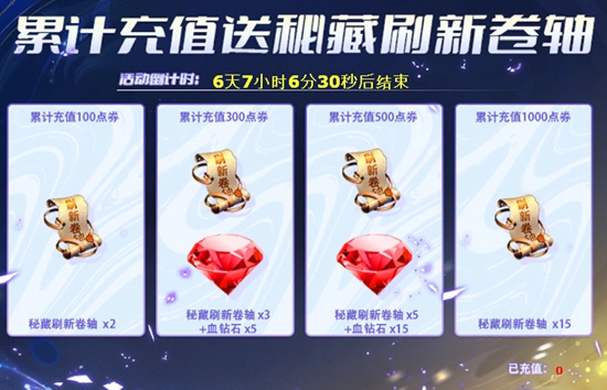 累计充值300点券,可得刷新卷轴*3,血钻石*5;