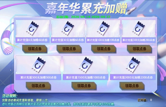 【奖励细则】仅限活动期间充值和领取,限领1次。参与直购类活动无法获得累充奖励。