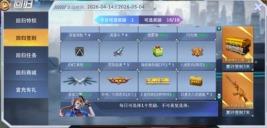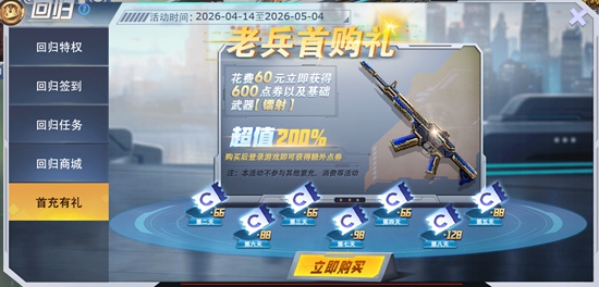 【参与方式】主界面右侧“老兵回归”按钮,选择回归商店页面