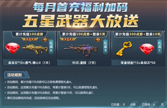 礼盒A领取条件:每月充值额度,首次达到100点券即可领取。