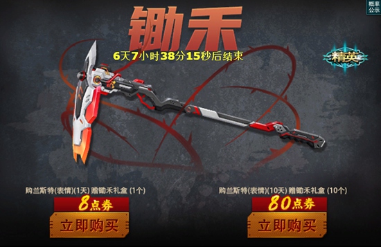 【活动细则】限定时间内,限时折扣价8点券购买兰斯特(表情)(1天),即可赠送锄禾礼盒一个。买表情(10天)送锄禾礼盒10个。