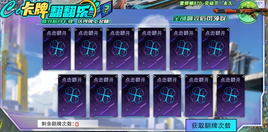 ①页面按钮“获取翻牌次数”可见战斗任务要求,按要求完成任务积累翻牌次数。(任务每日刷新,完成任务后尽快领取奖励,以免奖励逾期重置。)