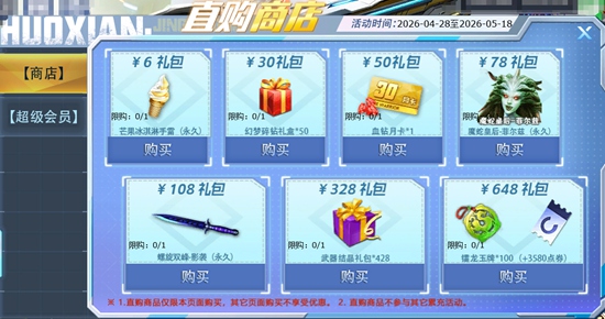 【活动内容】在界面点击即可以对应的价格获得指定道具: