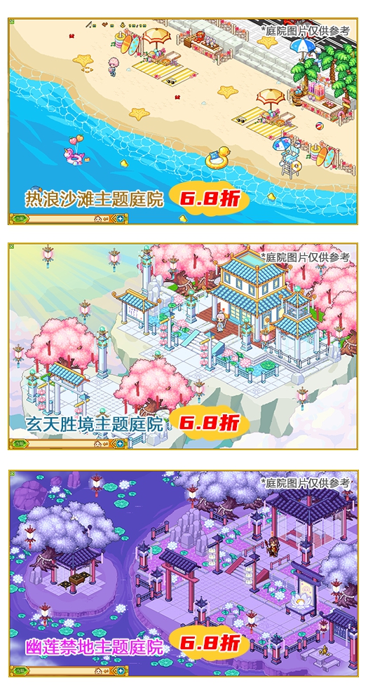 【热浪沙滩】、【玄天胜境】、【幽莲禁地】三款主题庭院双十一限时折扣!