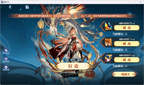每次失败提升10%成功概率(看脸的一关),每次打造次数2次,我是40%通过的