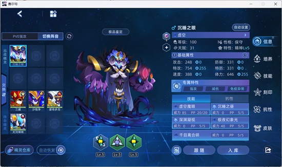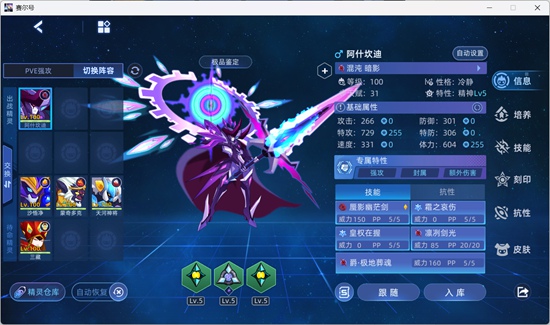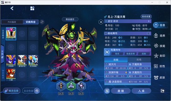 | 细胞激化 | 属性攻击 | -- | 5 | 57 | 必中;全属性+1,自身不处于能力提升状态时强化效果翻倍;4回合内每回合使用技能恢复自身最大体力的1/3并造成等量百分比伤害,恢复体力时若自身体力低于最大体力的1/2则恢复效果翻倍;下2回合令自身所有技能先制+2 | |