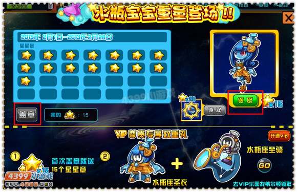 点击签到,VIP用户可以直接领取加缪奥斯,水瓶座的VIP赛尔还能领取套装和坐骑,别忘了领取哦
