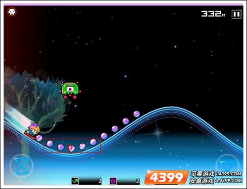 3、如图C所示,当游戏主角到达图中红色方框内,同时按住右下角加速槽即可获得飞快的速度。