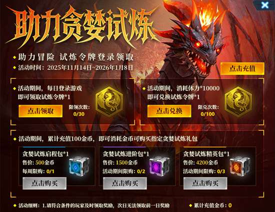 3、活动期间,累计充值100金币,即可消耗金币购买指定贪婪试炼礼包。