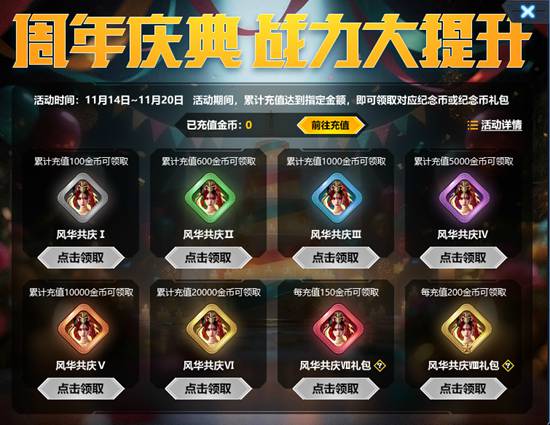 1、活动期间,累计充值指定金额,即可领取对应纪念币或纪念币礼包;