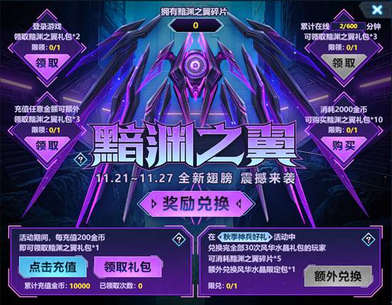 1、活动期间,达成不同条件,即可领取对应黯渊之翼礼包;