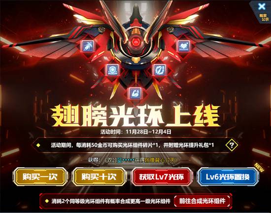 1,活动时间,每消耗50金币可购买光环组件碎片*1并附赠光环提升礼包*1;