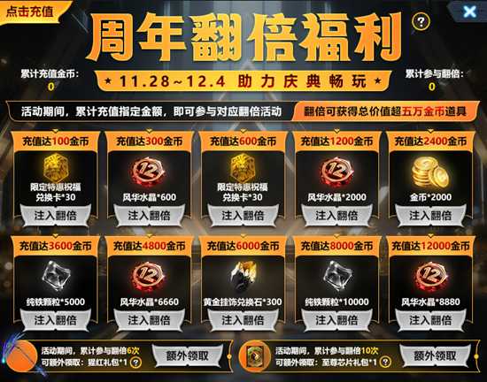 1、活动期间,累计充值指定金额,即可参与对应翻倍活动。