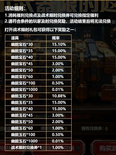 1.活动期间,每充值50金币可领取战术限时礼包*1,并额外附赠限定福利兑换点*1;