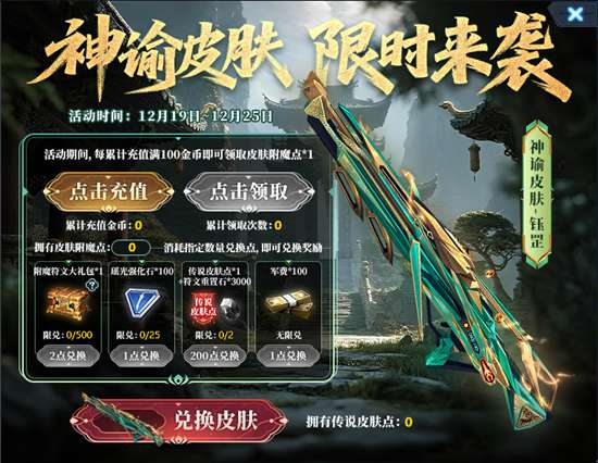 1、活动期间,每累计充值满100金币,即可领取皮肤附魔点*1;