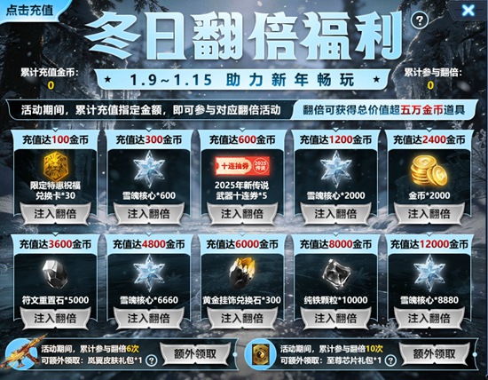 1、活动期间,累计充值指定金额,即可参与对应翻倍活动。
