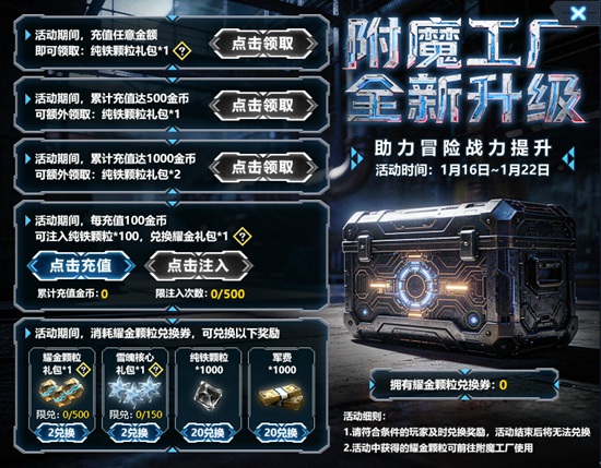 1,活动期间,达成指定条件,即可领取附魔工厂提升道具;