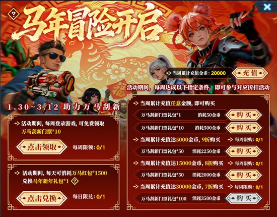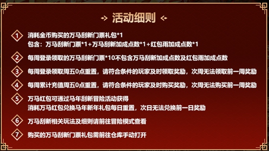 1.活动期间,每周登录游戏,可免费领取万马刮新门票*10;