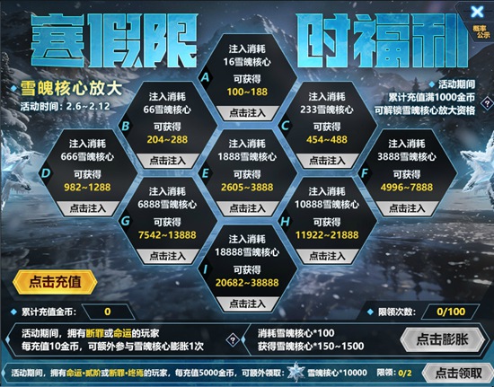 1、活动期间,累计充值满1000金币可解锁雪魄核心放大资格。
