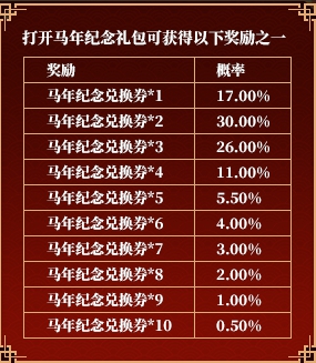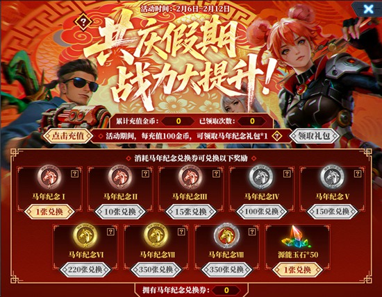 1.活动期间,每充值100金币,可领取马年纪念币礼包*1;