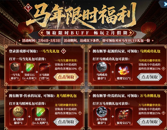 1.活动期间,达成指定条件,即可领取对应马年BUFF礼包一份;