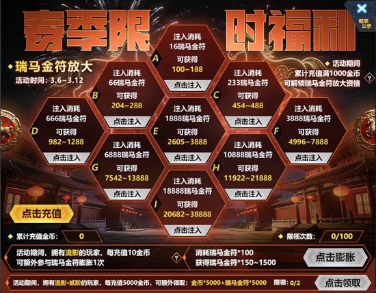 1、活动期间,累计充值满1000金币可解锁瑞马金符放大资格。