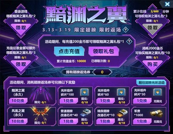 1、活动期间,累计充值满200金币可领取黯渊之翼礼包*1。