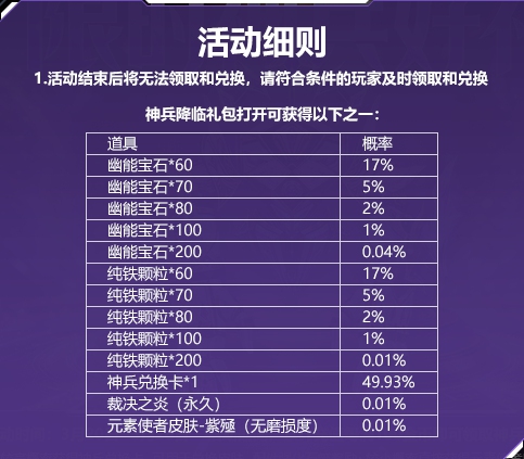 2、打开礼包有较高概率获得神兵兑换卡,可用于兑换皮肤、配件强化石等奖励,较小概率直接获得元素使者-紫殛;