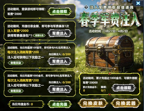 2、活动期间,充值达到指定条件,即可参与对应军费注入好礼;