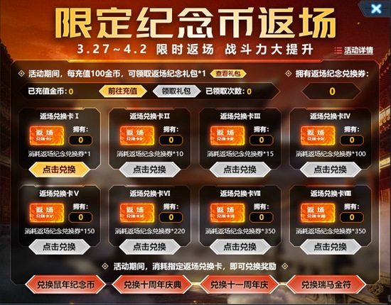 1、活动期间,每充值100金币,可领取对应纪念币礼包*1;