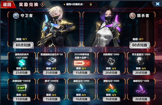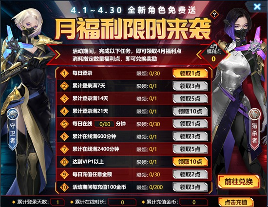 1.活动期间,每日完成对应任务,即可领取4月福利点,消耗指定数量福利点,即可兑换奖励;