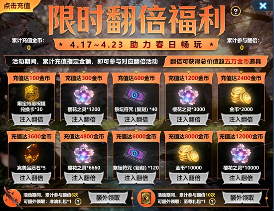 1、活动期间,累计充值指定金额,即可参与对应翻倍活动。