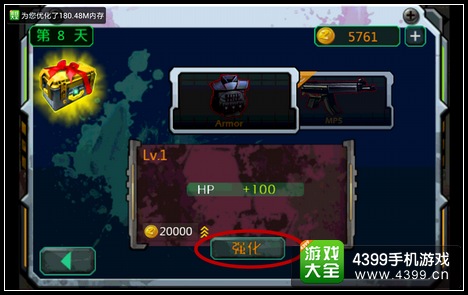2.到了第3天后,会出现可以自爆的僵尸,伤害非常高,而且移动速度很快,被爆一下要掉半管血,小伙伴们往往就是被它给直接秒掉的。所以这里时辰我推荐先去商城买下装备,更换一下武器,这样存活率可以大大提高。如图,点强化装备进入商城。