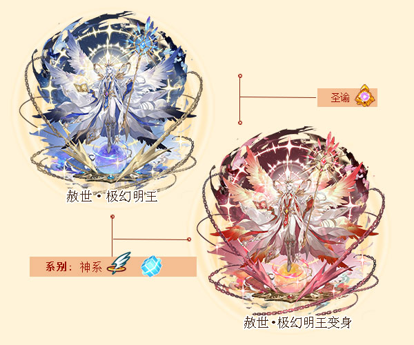 | T1 | 神系 | 一 | 魔法 | 40 | 6 | 魔法攻击,必定命中,不受无法行动的影响,根据自身的系别释放对应的圣域7回合,恢复自身40%生命值,不可修正,释放知源空间7回合 |