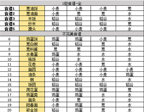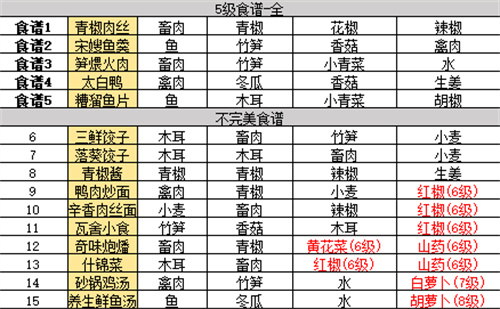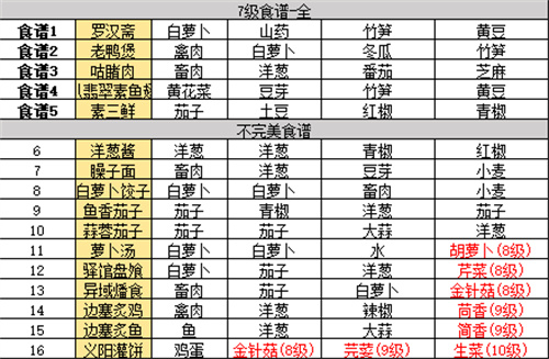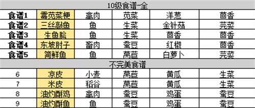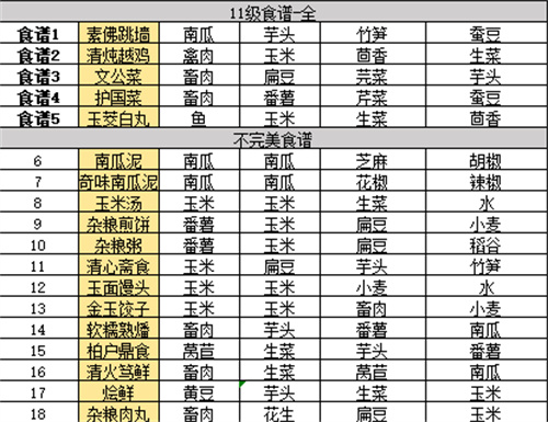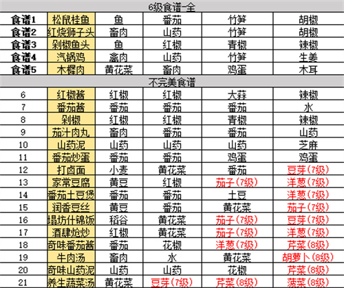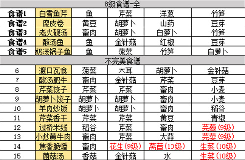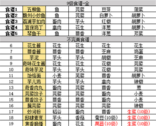 11级食谱。按照等级排列食谱,标红了高级食材的等级。不完美食谱中含有高级食材,当前无法解锁高品质食物,但可以通过替换为其他食物解锁图鉴。
