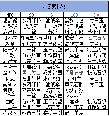 5、NPC好感度道具分为五个等级——绿、蓝、紫、橙、红,对应保底好感度为10、30、50、100、200,若赠送的好感度道具为NPC喜好道具,则获得的好感度翻倍。(驿差无喜好道具)