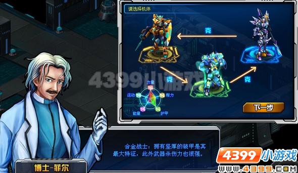 在游戏的初期,我们就可以在博士菲尔处选择一种机体作为主机体,这个时候我们就可以看到该种类机体在后期的发展。