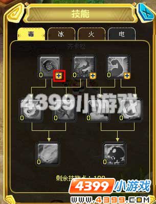 左键点击屏幕下方的技能图标(快捷键S),打开技能界面。左键点击想要升级的系别(毒、