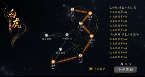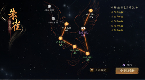 (2) 每个星点都有从白→绿→蓝→紫→橙5中不同品质的各类属性,(星点数量随着等级提升而提升)通过消耗碎星石进行星点的刷新(类似使用洗练石对装备,词条,进行洗练一样)。激活更多数量的紫色品质以上的星点可以激活右侧的特殊属性。锁定星点刷新,需要用到更多的碎星石。建议4个分支进行均衡提升,以激活更高的右侧属性为目标 。
