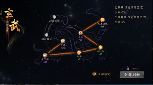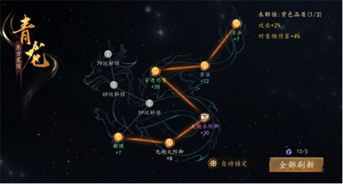 (2) 在刚开启四象玩法时,还有部分星点因等级限制还未解锁可先简单刷新几次获得战力加成,在等级升高解锁部分星点后可以再进行刷新。