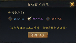 (3) 自动锁定功能:设置内“蓝及以上”,“紫及以上”“橙及以上”三个选项。可自主选择三个选项内的一个。(当词条出现以上品质时,自动为词条上锁)