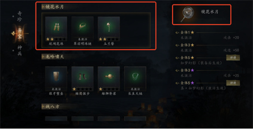 激活异宝【镜花水月】需要同时收集到奇珍【琉璃花珠】+【翠羽明珠链】+【玉兰簪】。