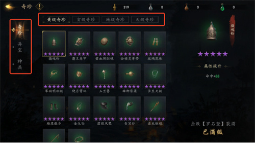 (2) 奇珍的品质:奇珍一共分为4个品质,从低到高依次为:黄级奇珍(绿色)→玄级奇珍(蓝色)→地级奇珍(紫色)→天极奇珍(金色)