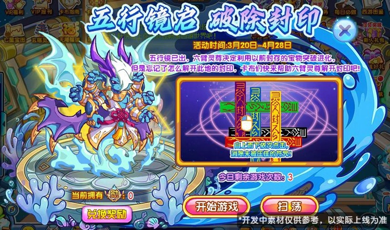五行镜已出,六臂灵尊决定利用以前封存的宝物突破进化,但是忘记了怎么解开此地的封印,卡布们快来帮助六臂灵尊解开封印吧!
