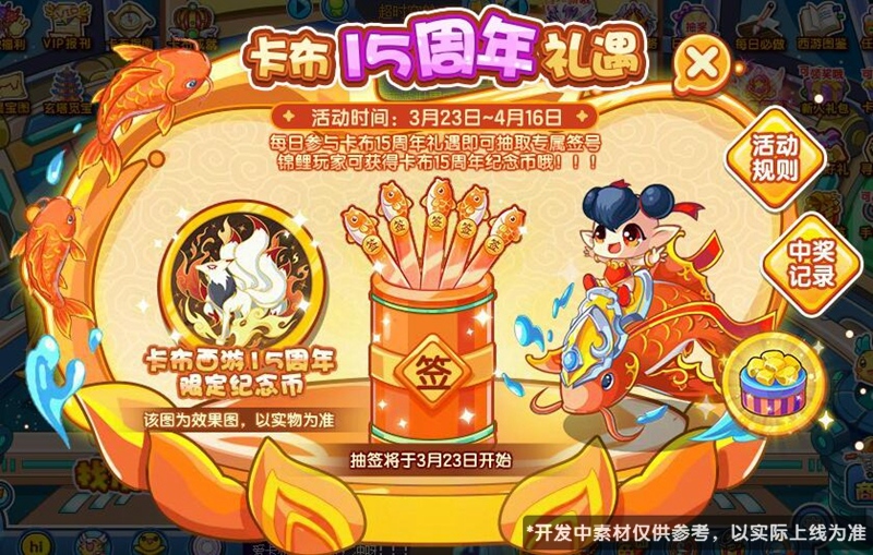 每日参与卡布15周年礼遇即可抽取专属签号,每日揭晓昨日锦鲤,锦鲤玩家可获得卡布15周年纪念币哦!!!