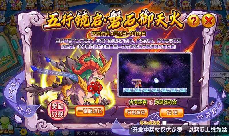五行镜灵韵席卷天地,山石兽王以大地为甲、磐石为盾,承接天火陨石的狂袭,小卡布们快和山石兽王一起完成这场突破极限的考验吧!