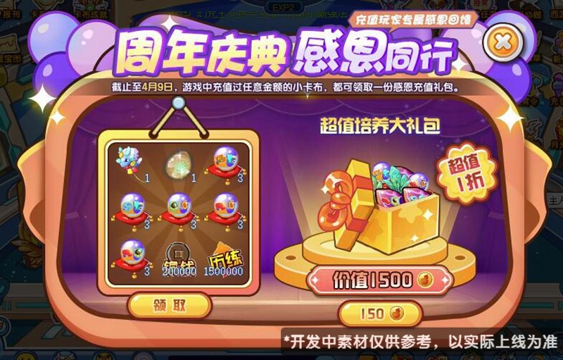 充值玩家专属感恩回馈,游戏中充值过任意金额的小卡布,都可领取一份感恩充值礼包!